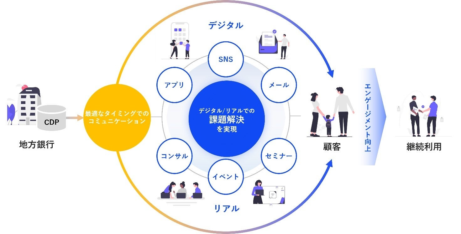 元来、地銀と地域住民の繋がりは強く、これまでは担当の行員が直接的で頻繁なコミュニケーションにより、顧客の地銀に対するエンゲージメント向上を図っていましたが、昨今、行員を介さないデジタルでのコミュニケーションが増加しています。デジタルにおいても対面と同等のコミュニケーションの品質を求められていることから、今回、対面でもデジタルでも顧客のデータを正しく把握し、顧客それぞれに寄り添った提案を行うことで、短期的な売上効果だけでなく中長期なエンゲージメント向上を図ります。