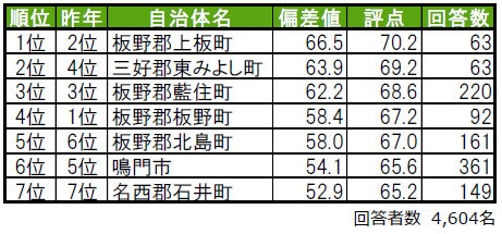 今年は板野郡上板町が、1位に輝きました。2位は、昨年4位から順位を上げた三好郡東みよし町です。3位は、2年連続で板野郡藍住町です。トップ7の内、6つが郡部に属する「町」、また、その内4つが板野郡の町という結果になっています。
