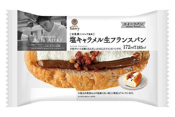 【内容】生クリームを練りこんだしっとりとしたフランスパン生地に、コクのあるビターキャラメルソースと、塩味をきかせたミルクホイップをサンドして、キャンディングアーモンドをトッピングしました。