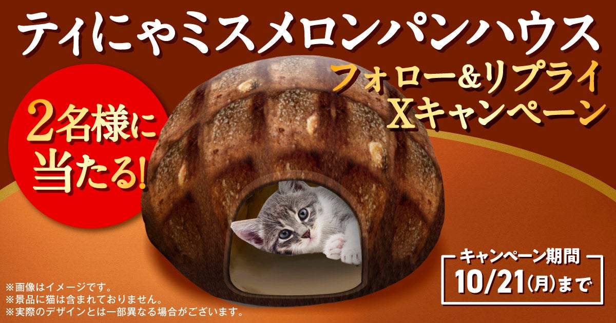 ファミリーマート公式Xアカウント(@famima_now)をフォローの上、指定のハッシュタグをつけてリプライするとティラミスメロンパン ヘーゼルナッツコーヒークリーム型のペットハウス「ティにゃミスメロンパンハウス」が抽選で2名さまに当たります。