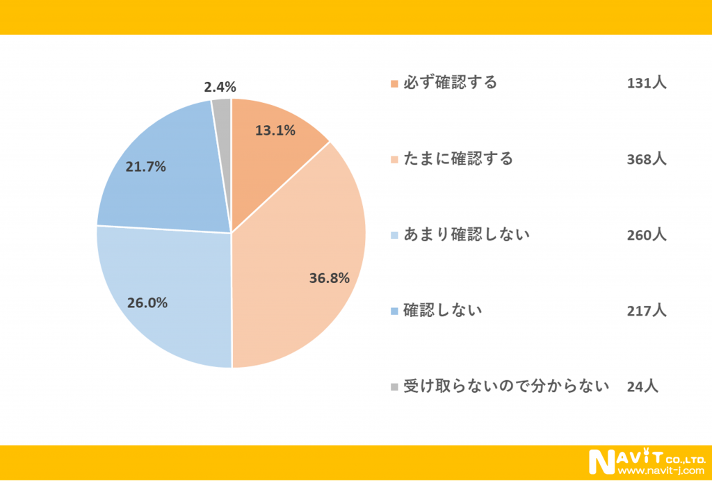 「受け取ったポケットティッシュ内の広告を確認しますか?」という質問については、「必ず確認する」が13.1%、「たまに確認する」が36.8%と合わせると49.9%の人が確認していることが分かりました。