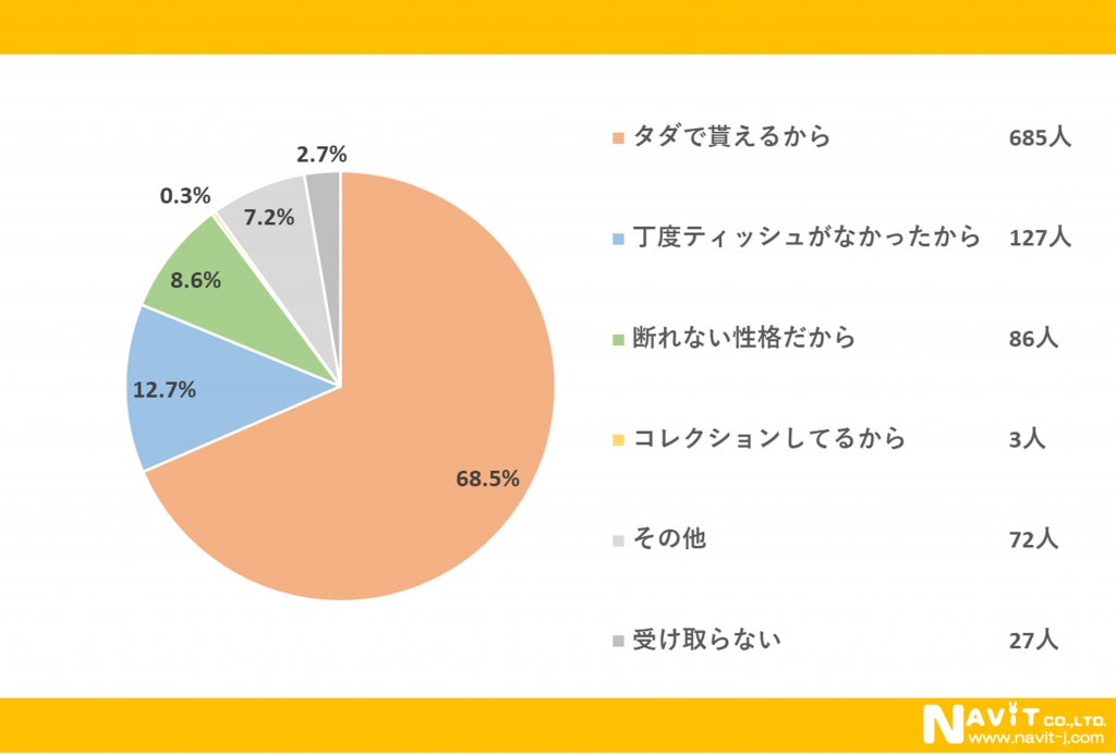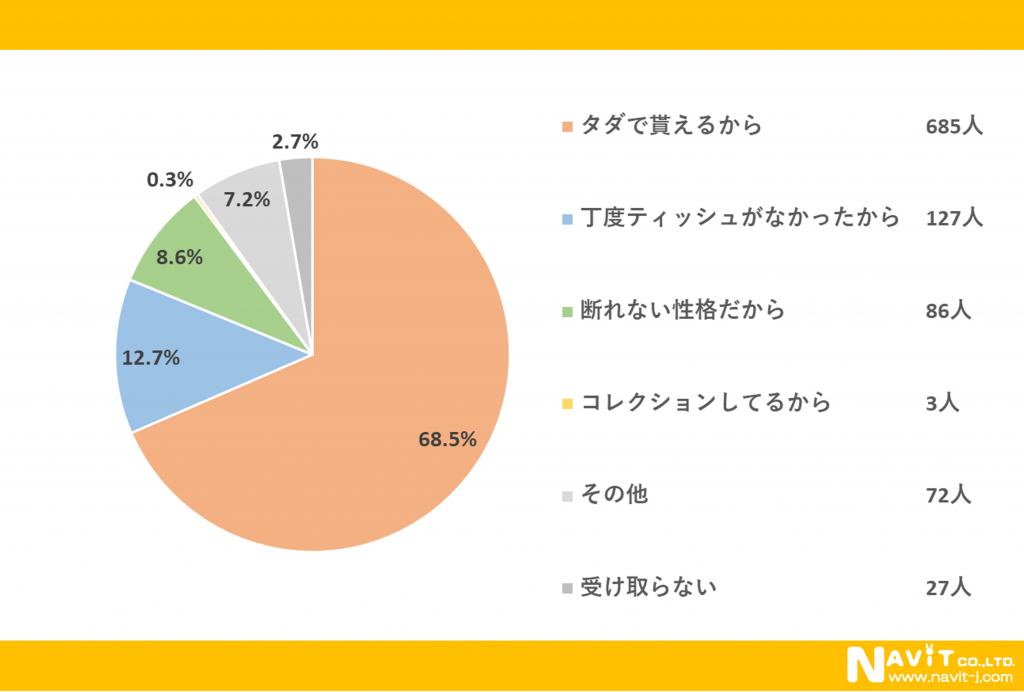街頭で配布されているポケットティッシュを受け取る理由は、「タダで貰えるから」が最多