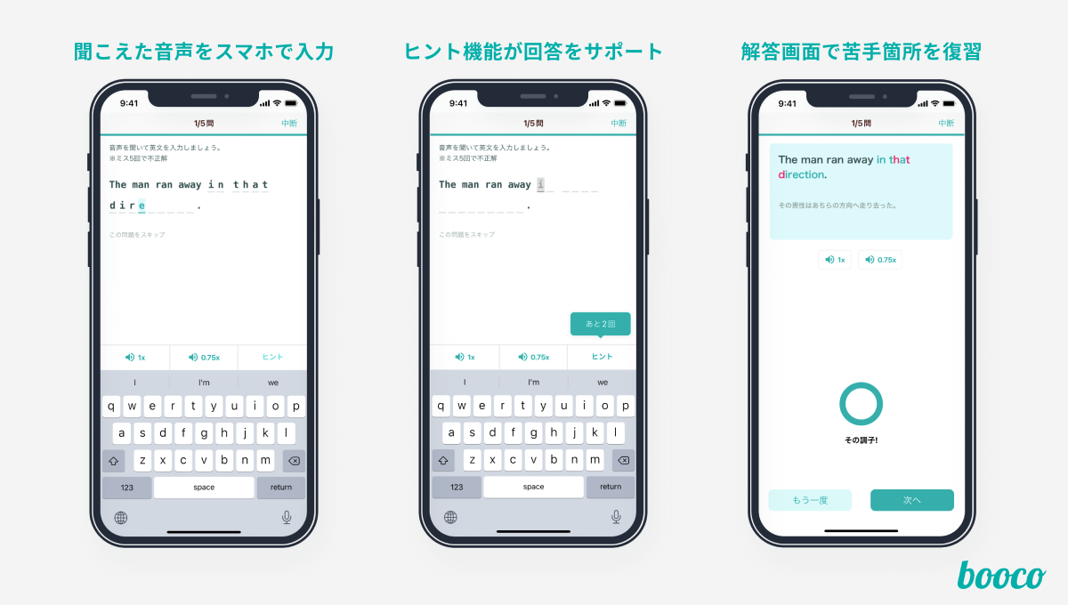 英語学習アプリ「booco」、ディクテーション機能をリリース