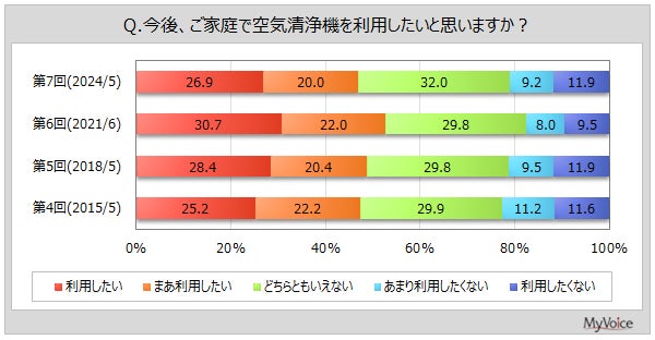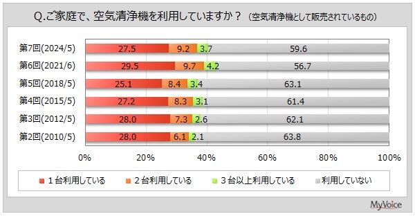 <今 回>(2024/5)https://myel.myvoice.jp/products/detail.php?product_id=31007 上記設問の他に、「空気清浄目的で利用している家電」「空気清浄機の購入時期」も聞いています。 <第6回>(2021/6)https://myel.myvoice.jp/products/detail.php?product_id=27504 <第5回>(2018/5)https://myel.myvoice.jp/products/detail.php?product_id=23805 |