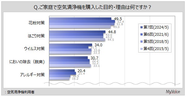 空気清浄機利用者に購入した目的・理由を聞いたところ(複数回答)、「花粉対策」が49.5%、「ほこり対策」が44.8%、「ウィルス対策」「においの除去(脱臭)」が各3割強です。