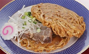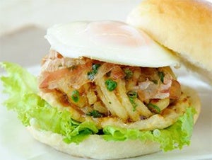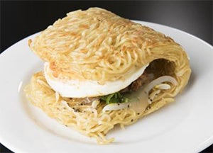 醤油ベースの豚骨スープが特徴の喜多方ラーメンをモチーフにしたインパクト大のご当地バーガー。バンズに見立てた麺や具材にも地元食材を使用し、豚の角煮、メンマ、ナルトなどのラーメンの具をサンド。味わいも忠実に再現した一品。