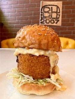 地元のソウルフードとして長年愛されている名物「牛骨ラーメン」を専門店がバーガーにアレンジ。鳥取県産の豚肩ロースを煮込んだチャーシューや煮玉子風目玉焼きなど、具材はほぼラーメンと同じ。片手でラーメンが味わえる、見た目もワイルドなバーガー。