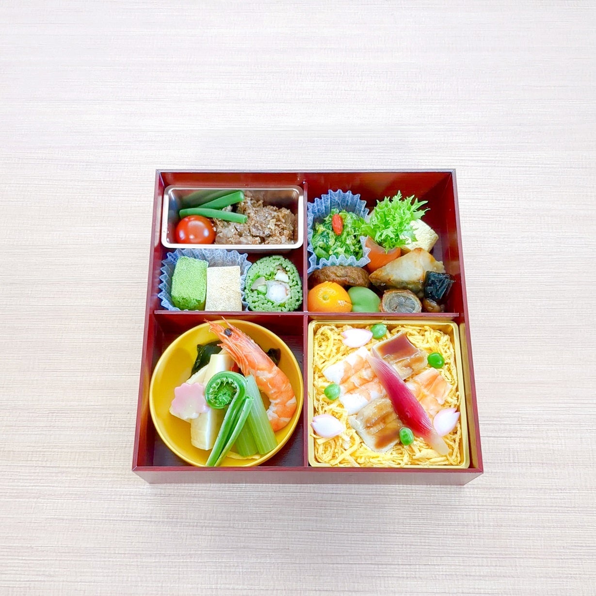 お花畑をイメージしたちらし寿司と肉、魚、野菜の煮物、桜餅を詰め込んだ母の日限定の二段弁当です。