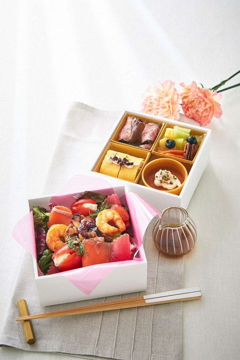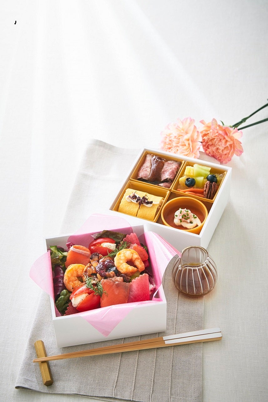 朱色に染めた華やかな折箱に、プチトマトや枝豆、花びらゆり根で鮮やかにトッピングした魚そうめんジュレ掛けなど、母の日のお祝いに贈る限定のお弁当です。