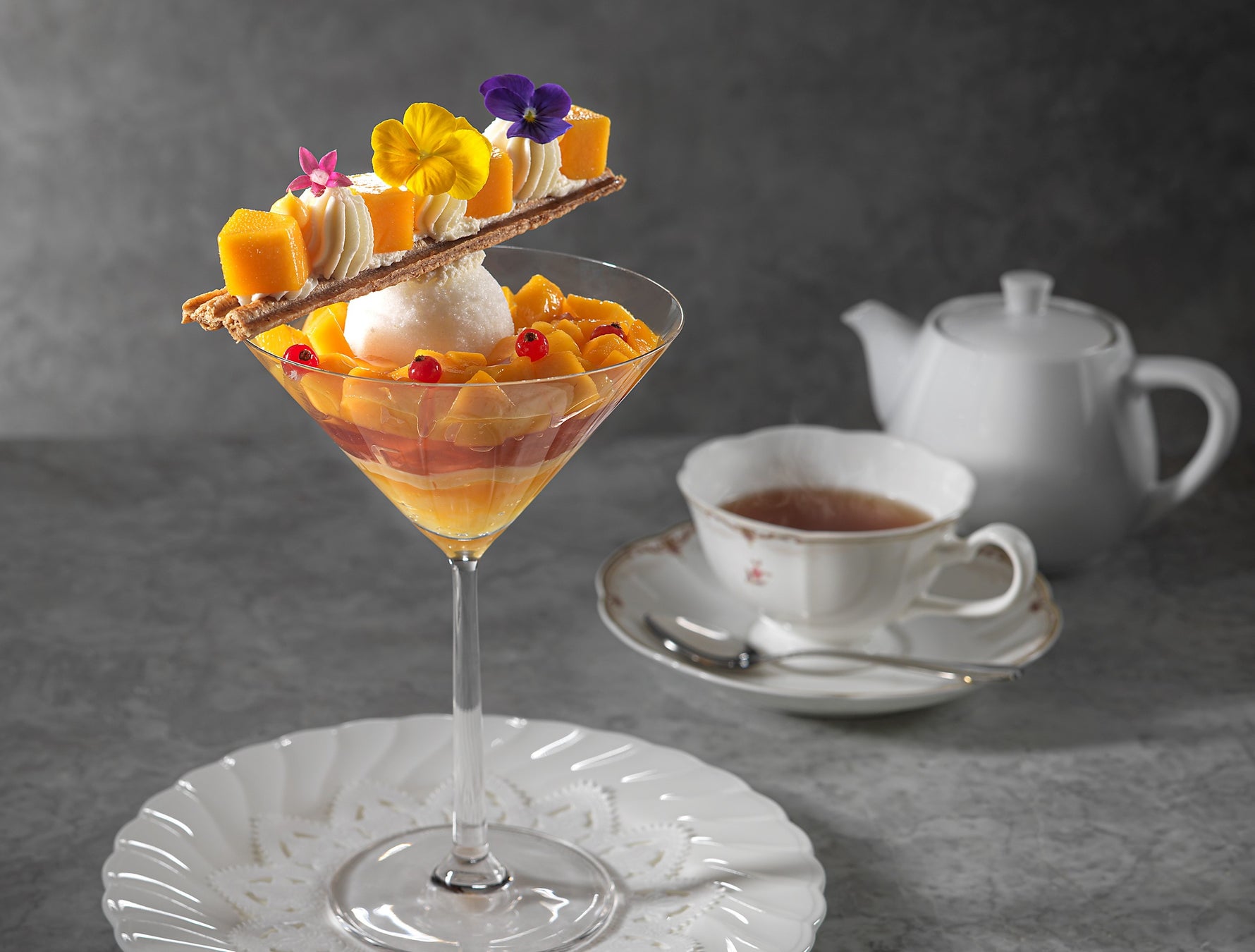 また、フレッシュマンゴーをグラス一面に敷いたパフェでは、スミレジュレ、パッションフルーツのクリーム、パインアップルのソースを順に盛り込み、様々な味わいの変化を演出。さっぱりとしたレモンシャーベットと、香り高いスミレジュレは、マンゴーの甘みを引き立て絶妙なハーモニーを生み出します。