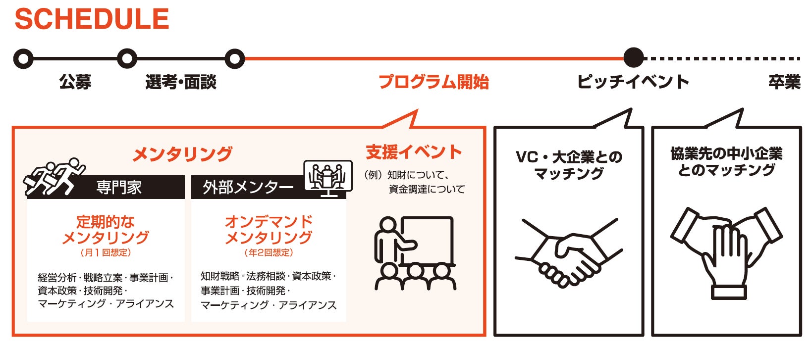 IPOやM&A等を目指すスタートアップ企業及び個人を対象に、資金調達や事業提携に向けて、担当の専門家が伴走型支援による事業計画のブラッシュアップを行う、成長加速化プログラムです。2019年度に事業を開始しており、これまでに10回の公募・採択を行っております。