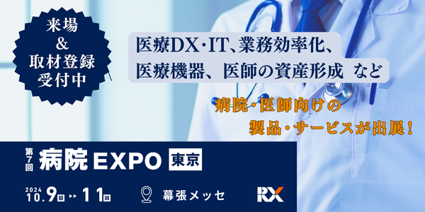 第7回 病院EXPO【東京】とは、医療DX/IT・医療機器・業務効率化・医師向け資産掲載など病院・医師・看護に関する製品・サービスが一堂に出展する医療・介護・ヘルスケアの展示会です。