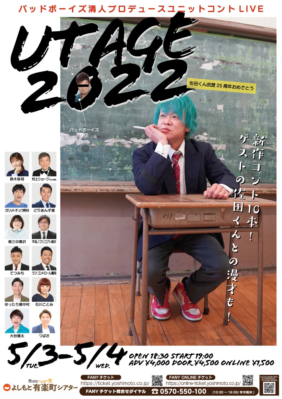 バッドボーイズ清人プロデュースユニットコントLIVE第三弾!スペシャルゲストも登場!「UTAGE 2022~佐田くん芸歴25周年おめでとう~」