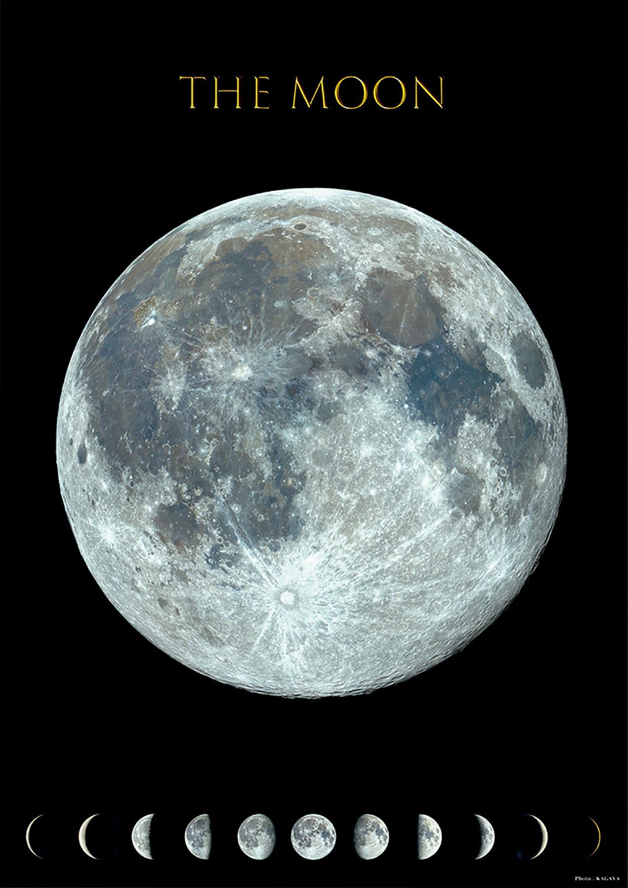天体写真家KAGAYAの撮影による、美しい月面写真が印刷されたA1サイズポスター。立体感溢れる満月の写真に月の満ち欠けを配し、特殊蓄光インクの夜光効果により夜に電灯を消すと月の輝きが浮かび上がります。