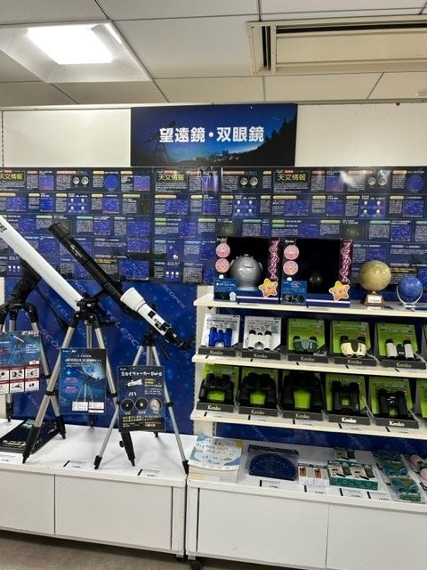 星空観察アイテムコーナーには、Kenkoの望遠鏡、双眼鏡や、星座早見盤、プラネタリウムNEWスターミュージアムなどをラインアップ。