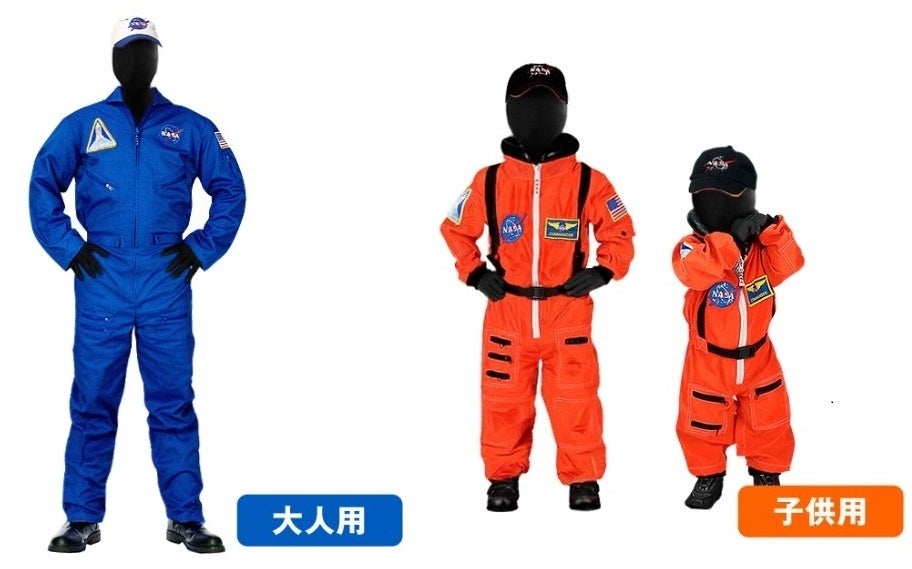 宇宙飛行士が会見などの時に着用する宇宙飛行士訓練服のレプリカ。NASAのロゴ入りキャップ付き