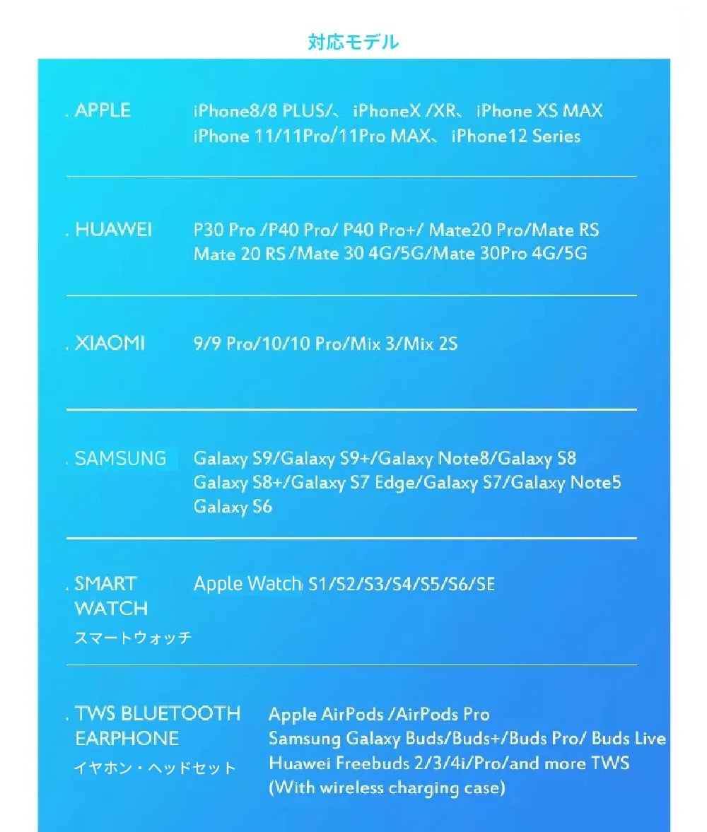 図をご参考に、お手持ちの機種がQiワイヤレス充電に対応しているかをご確認の上でお使いください。
