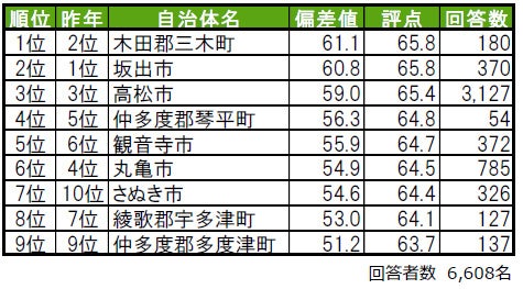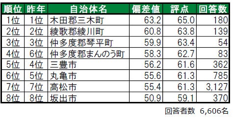 木田郡三木町が、2年連続で1位に輝きました。2位も2年連続で綾歌郡綾川町です。3位は、3年連続で仲多度郡琴平町です。4位は、昨年6位から順位を上げた仲多度郡まんのう町で、トップ4は全て郡部に属する「町」という結果になっています。