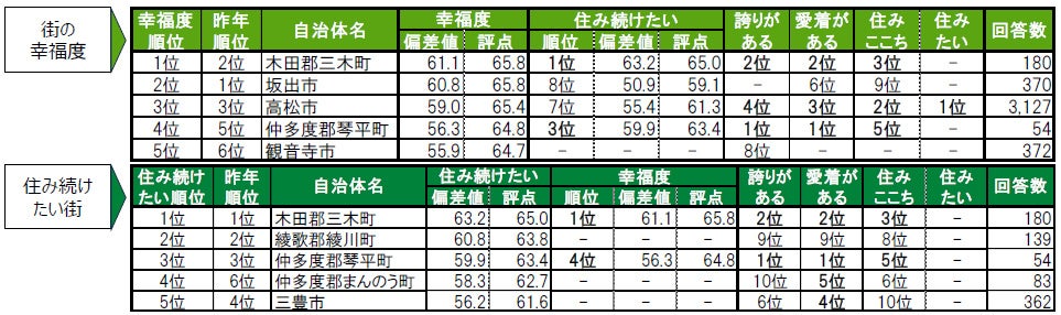 住み続けたい街のトップ2は2年連続で、1位木田郡三木町、2位綾歌郡綾川町。3位は3年連続で仲多度郡琴平町。