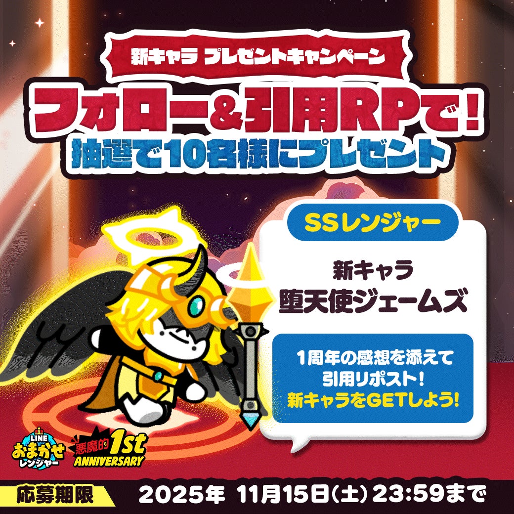 期間中、「LINE おまかせレンジャー」の公式X(旧Twitter)アカウント(https://x.com/LINE_OMAREN_JP )をフォローしてキャンペーンポストに1周年の感想を添えて引用リポストすると、抽選で新SSレンジャーが当たるキャンペーンを開催します。
