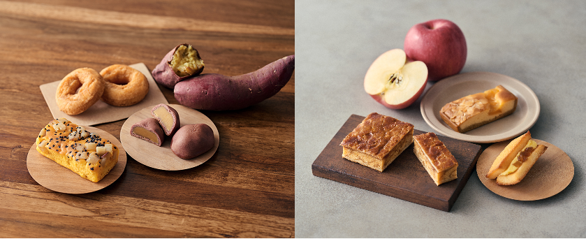 晩秋から冬にかけて旬を迎えるさつまいもとりんごの両方のお菓子をそれぞれ発売します。食べきりサイズのお菓子や、みんなで分け合える大袋のお菓子など、全14種類の和洋のお菓子を揃えました。さつまいものお菓子は、お菓子の種類に合わせてさつまいもの品種を変えています。スイートポテトケーキのトッピングはほっくりとした紅はるか、安納芋まんじゅうのあんは滑らかな食感の安納芋を使用しています。りんごのお菓子は、相性の良いシナモンやナッツを入れることで、具材の食感やりんごの味わいをより楽しんでいただけるようにしています。りんごとキャラメルのケーキは蜜漬けりんご、くるみ、アーモンドをトッピングし、具材感たっぷりに仕上げています。焼りんごのカットバウムは爽やかなリンゴの香りに、ほんのりとシナモンを効かせて焼きりんご風味に仕上げています。