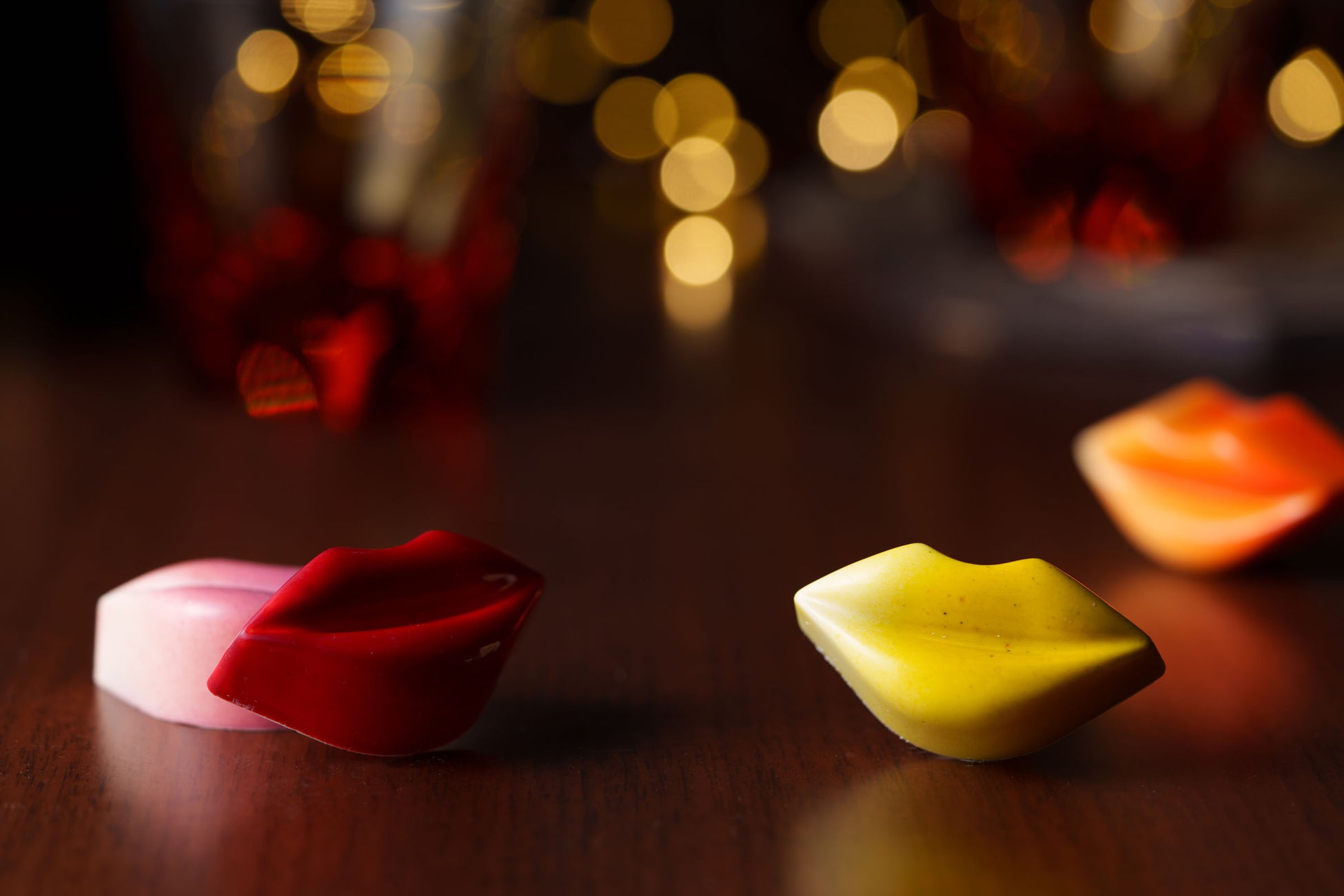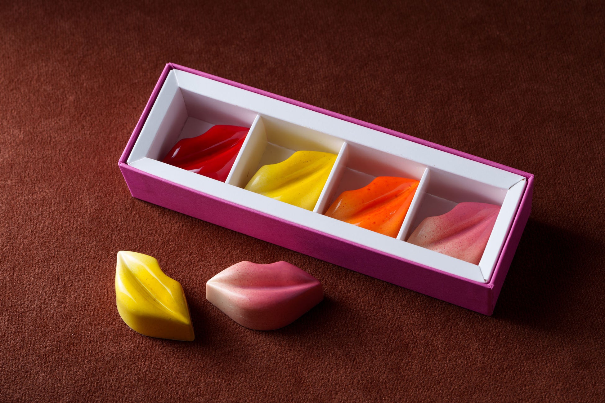 艶やかなリップ型のチョコレートは、コスメの色合いをイメージし、色鮮やかに仕上げました。スイートなミルクチョコレートにフルーツなどを組み合わせた多彩な味わいのボンボンショコラです。