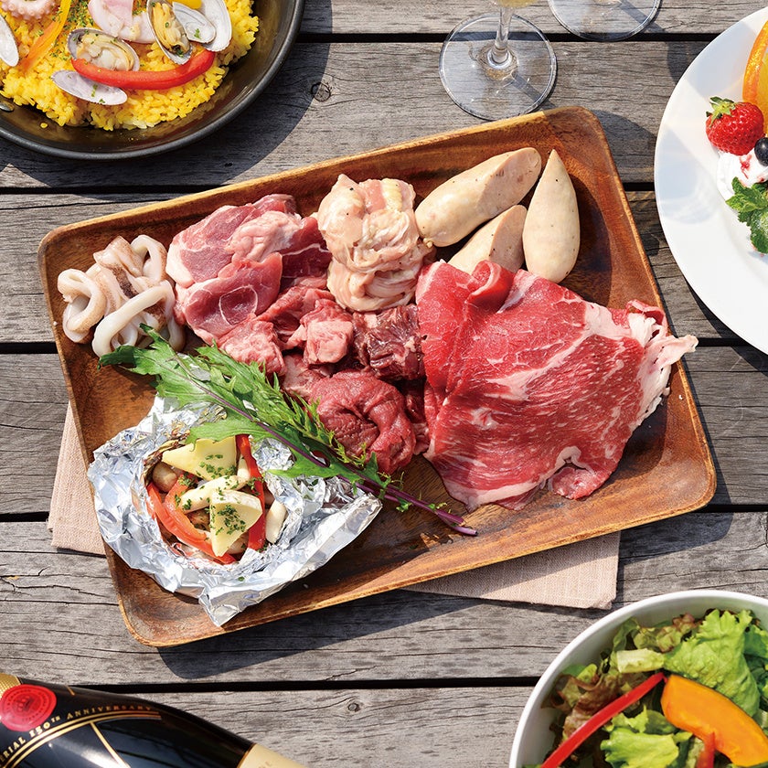 スペイン産豚肩ロース、鶏ハラミのスパイシーマリネ、粗挽きジャンボソーセージ、ふわふわ鶏胸肉、牛カルビ、スペイン産豚バラスモーク、スライス牛タン、スペアリブ、スペイン産イベリコ豚、黒毛和牛もも肉、厚切りリブステーキ、特製BBQソース
