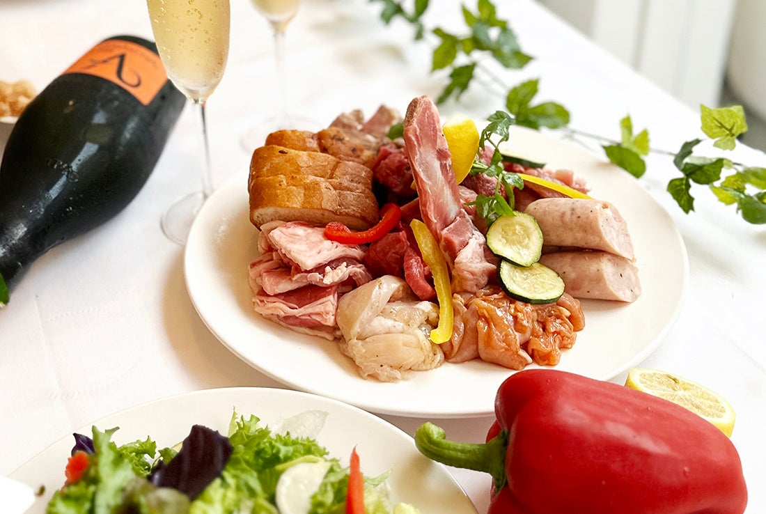 スペイン産豚肩ロース、鶏ハラミのスパイシーマリネ、粗挽きジャンボソーセージ、ふわふわ鶏胸肉、牛カルビ、スペイン産豚バラスモーク、スライス牛タン、スペアリブ、特製BBQソース