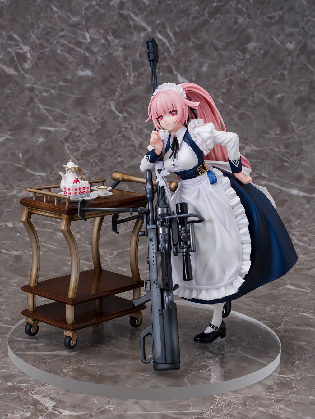 スキンテーマ「見習いメイドの日」で実装されたエプロンドレスのメイド服姿をオリジナルイラストに忠実に完全立体化。元々は原型師Rico氏の個人制作ガレージキットであった本作は、この度の商品化にともない造形から全面的にブラッシュアップを施した渾身の一作となった。たっぷりと布地の使われた衣服のシワ表現や、銃器のパーツごとに塗り分けられているリアルな質感を少し大きめの1/6スケールで存分に楽しめるゴージャスな仕上がりに。 銃器はCADデータから金型を起こし、かっちりとした形状のものをお届けする。また、ティーセットの乗ったサービングカートが付属パーツとして同梱されるのも嬉しい。