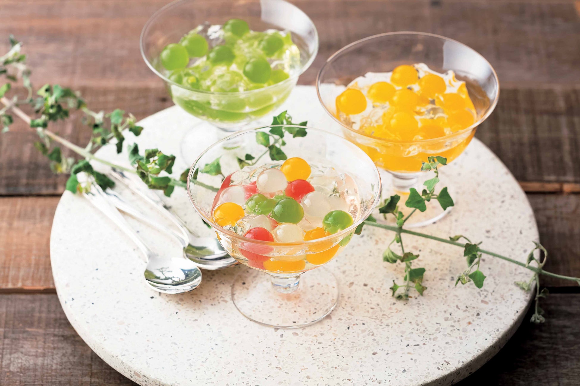 目にも、涼やかな夏いろ。フルーツの果汁を使った彩り豊かなゼリーボールを、優しい甘さのジュレと合わせました。