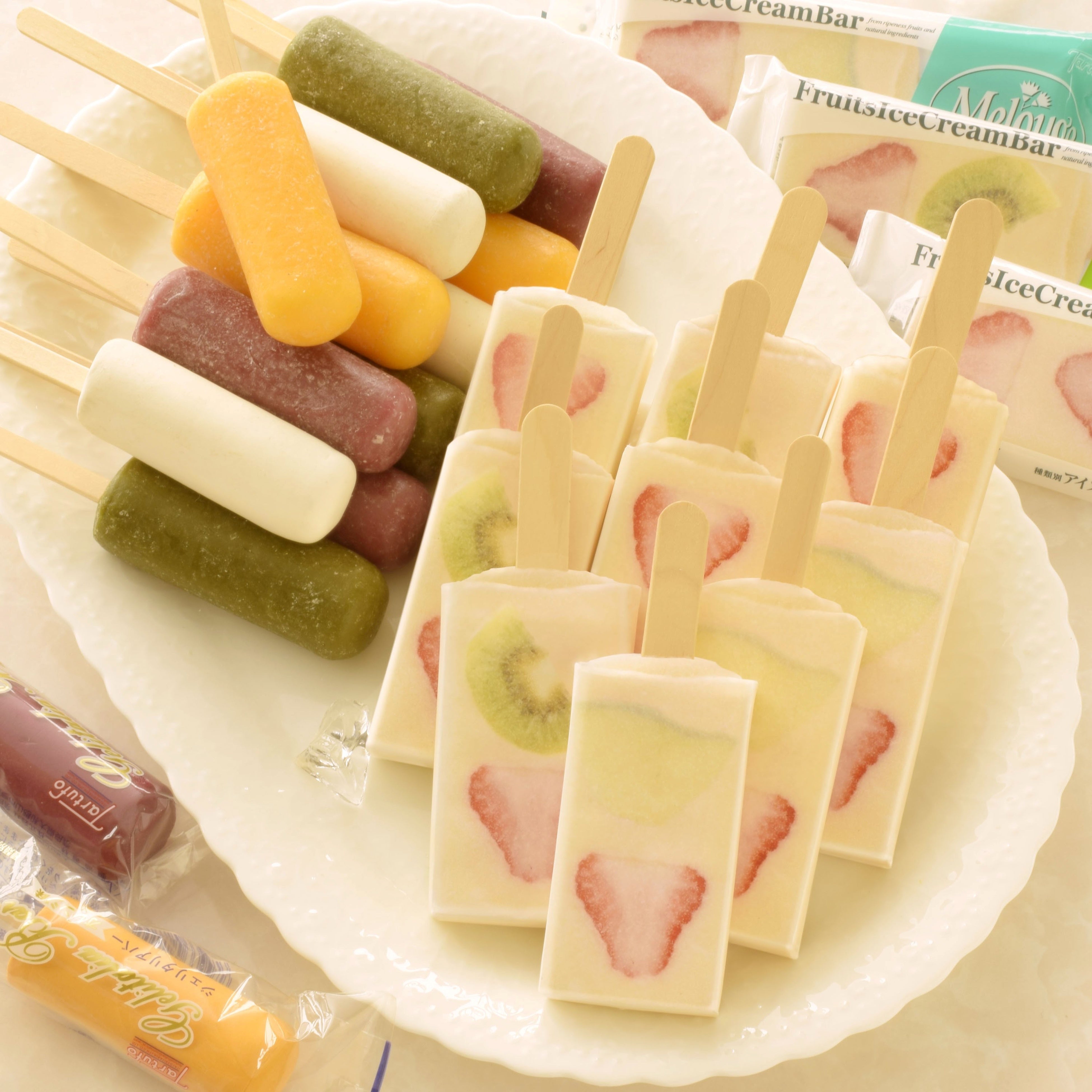 イチゴやメロン、キウイなどのスライスしたフルーツを張り付けたメロージュや、オレンジ、グレープ、ミルクや抹茶のジェリタリアバーのセット。