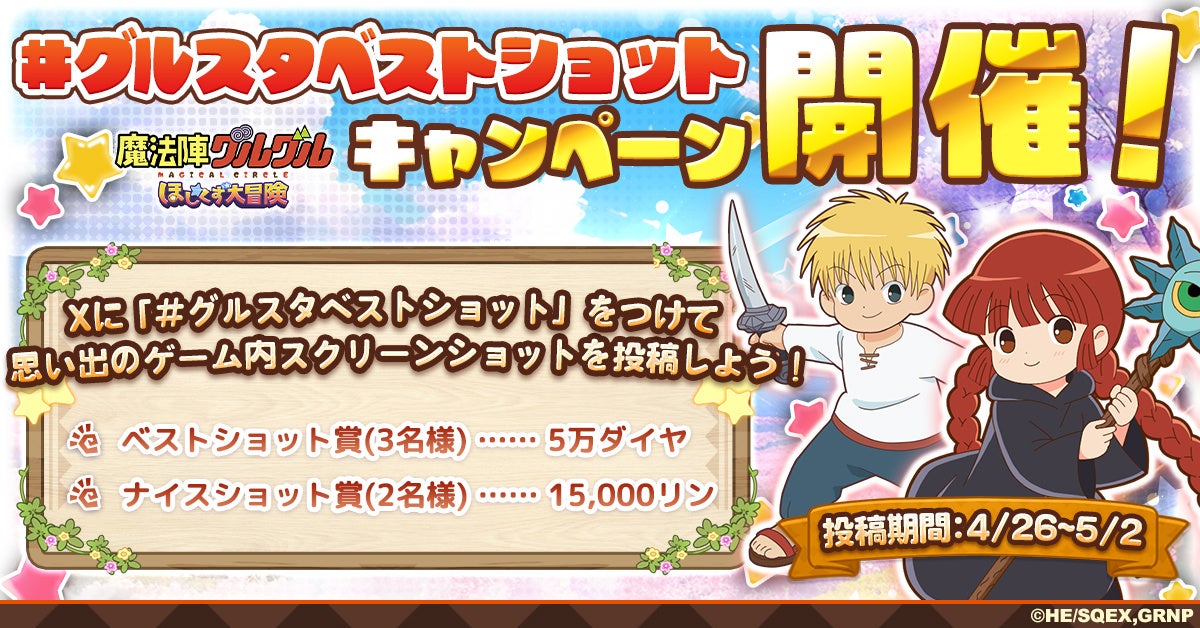 『魔法陣グルグル ほしくず大冒険』の1周年を記念し、第一弾企画としてプレイヤーの皆様からスクリーンショットを募集する「#グルスタベストショット」キャンペーンを実施いたします。