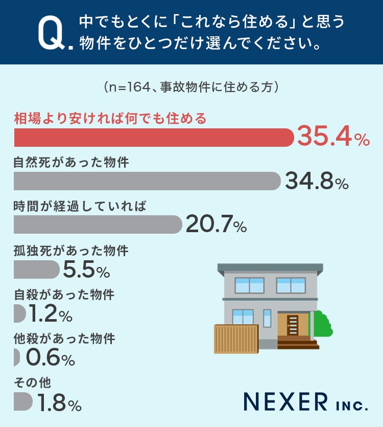 「相場より安ければ何でも住める」が35.4%、「自然死があった物件」が34.8%という結果になりました。
