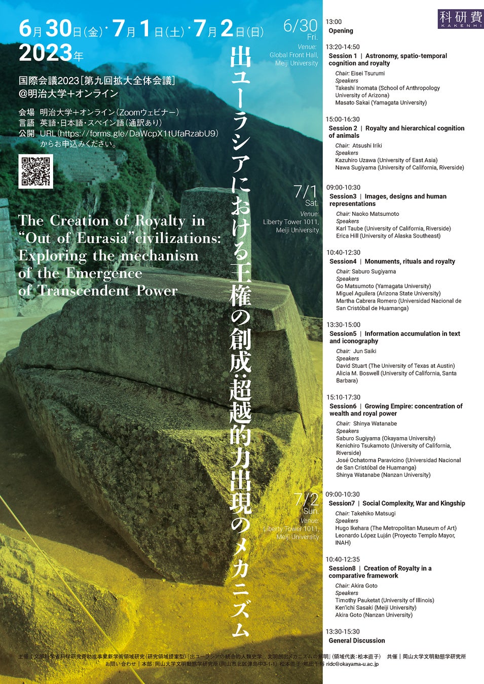 この度、RIDC共催で文部科学省科学研究費助成事業新学術領域研究(研究領域提案型)『出ユーラシアの統合的人類史学 文明創出メカニズムの解明』(領域代表:松本直子)主催の新学術領域研究「出ユーラシアの統合的人類史学」第9回拡大全体会議-出ユーラシアにおける王権の創成:超越的出現のメカニズム-を、2023年6月30日(金)、7月1日(土)、2日(日)の3日間、現地開催(明治大学駿河台キャンパス)とオンライン(zoom)でのハイブリッド形式で開催します。