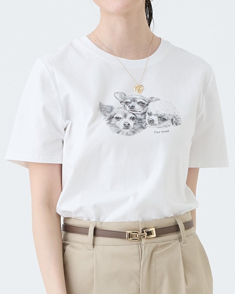 日差しが心地よくなるこれからの季節。N+では、1枚でも、羽織りのインナーとしても主役になるフォトプリントTシャツをご用意しました。3匹の愛らしい犬や猫のプリントが目を引くデザインながら、モノクロ配色に仕上げることで、甘くなりすぎず、デイリーにコーディネートしやすいカジュアル感を演出しています。肌触りやわらかな綿混素材を採用し、快適な着心地と、デニムや麻のパンツといった季節の定番ボトムスとも相性抜群のシルエットが特長です。