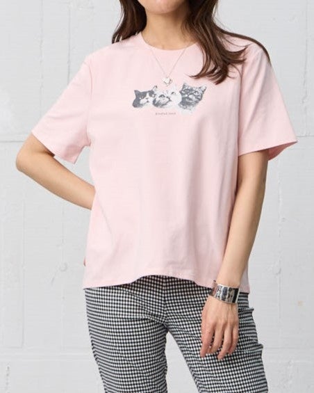 3匹の愛らしい猫プリントが主役。柔らかな肌触りで、デニムや麻素材のパンツと合わせたリラックス感のある着こなしもおすすめです。