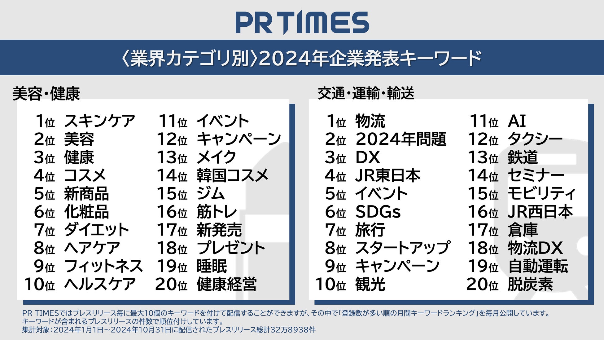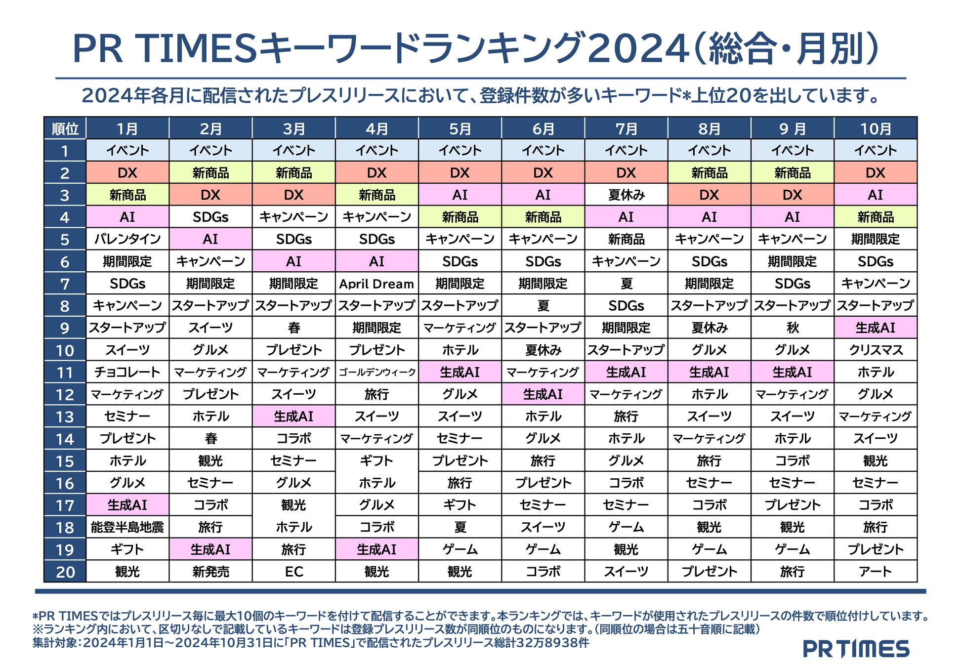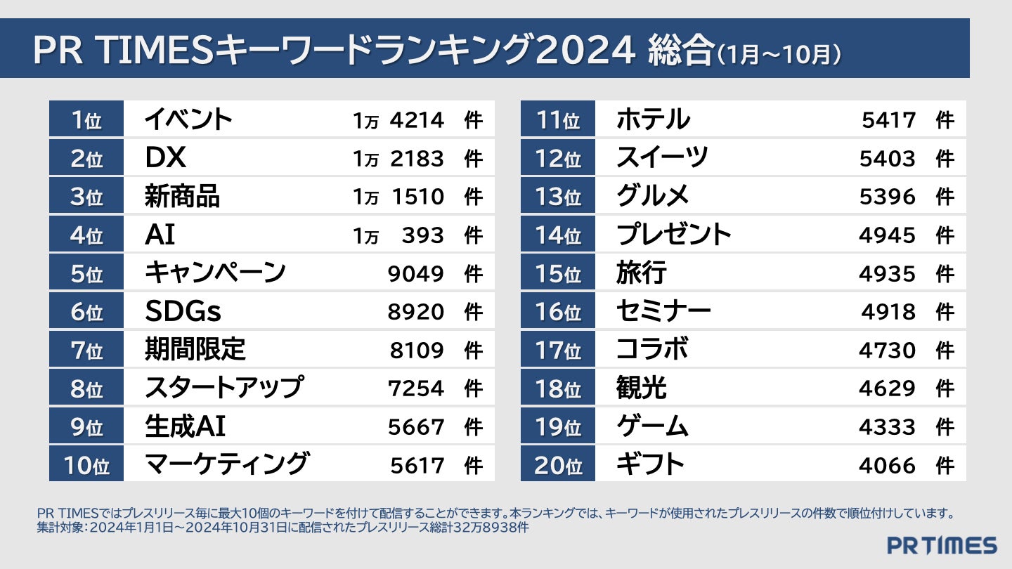 「PR TIMES」ではプレスリリース発表の際に、発表企業がプレスリリース内容に関係するキーワードを最大10個登録することができます。2024年1~10月に発表された総計32万8938件のプレスリリースのキーワード登録総数は39万6227種に上りました。総合ランキングでは2024年の企業活動の潮流を、そして月別ランキング推移からは企業動向の変遷と流行の兆しをキーワードを通して分析しています。