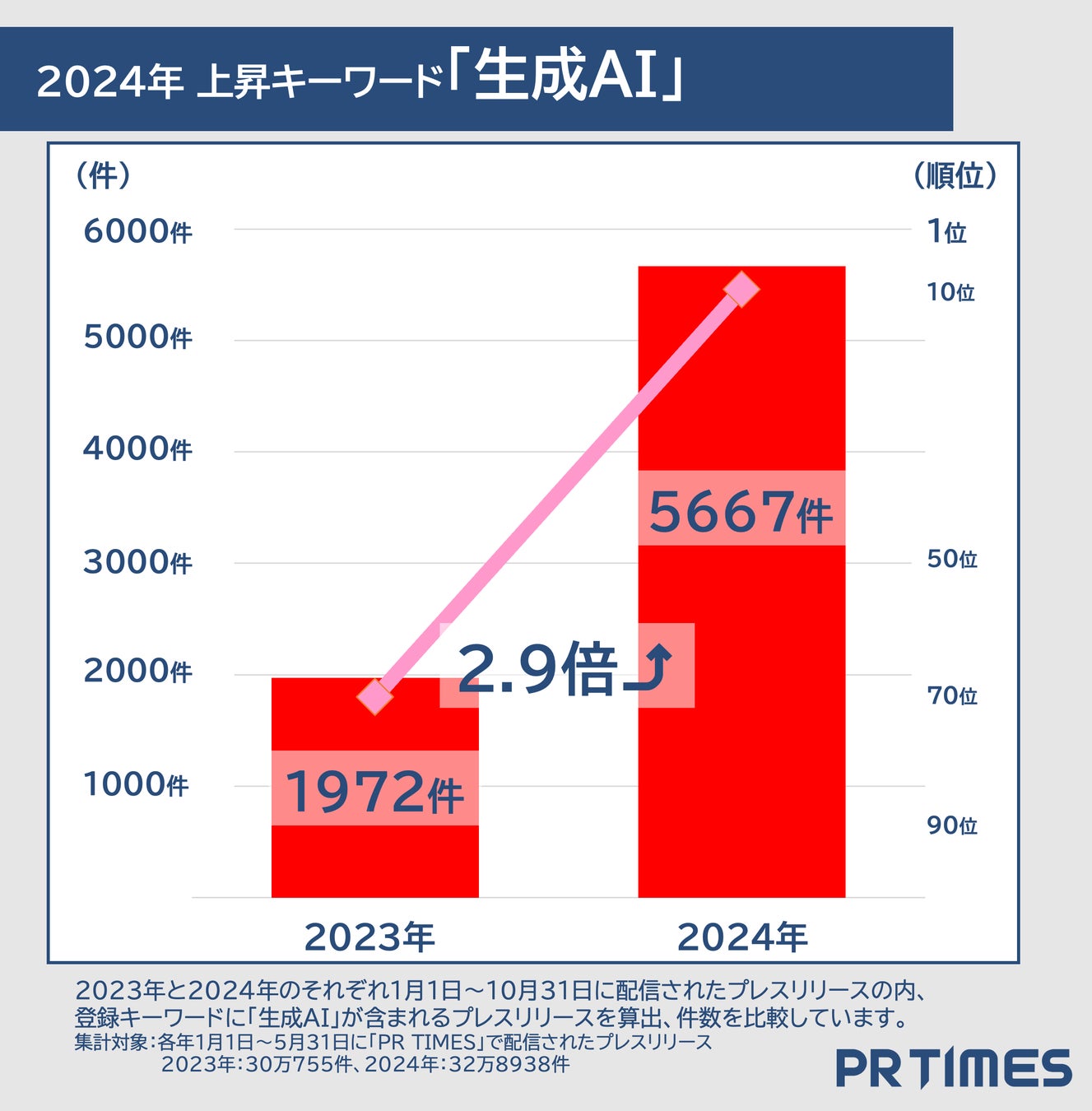 急上昇キーワードランキングでは、2023年と2024年のそれぞれ同期間(1月1日〜10月31日)におけるキーワードが使用されたプレスリリースの件数の増加数が多い順にランキングしています。
