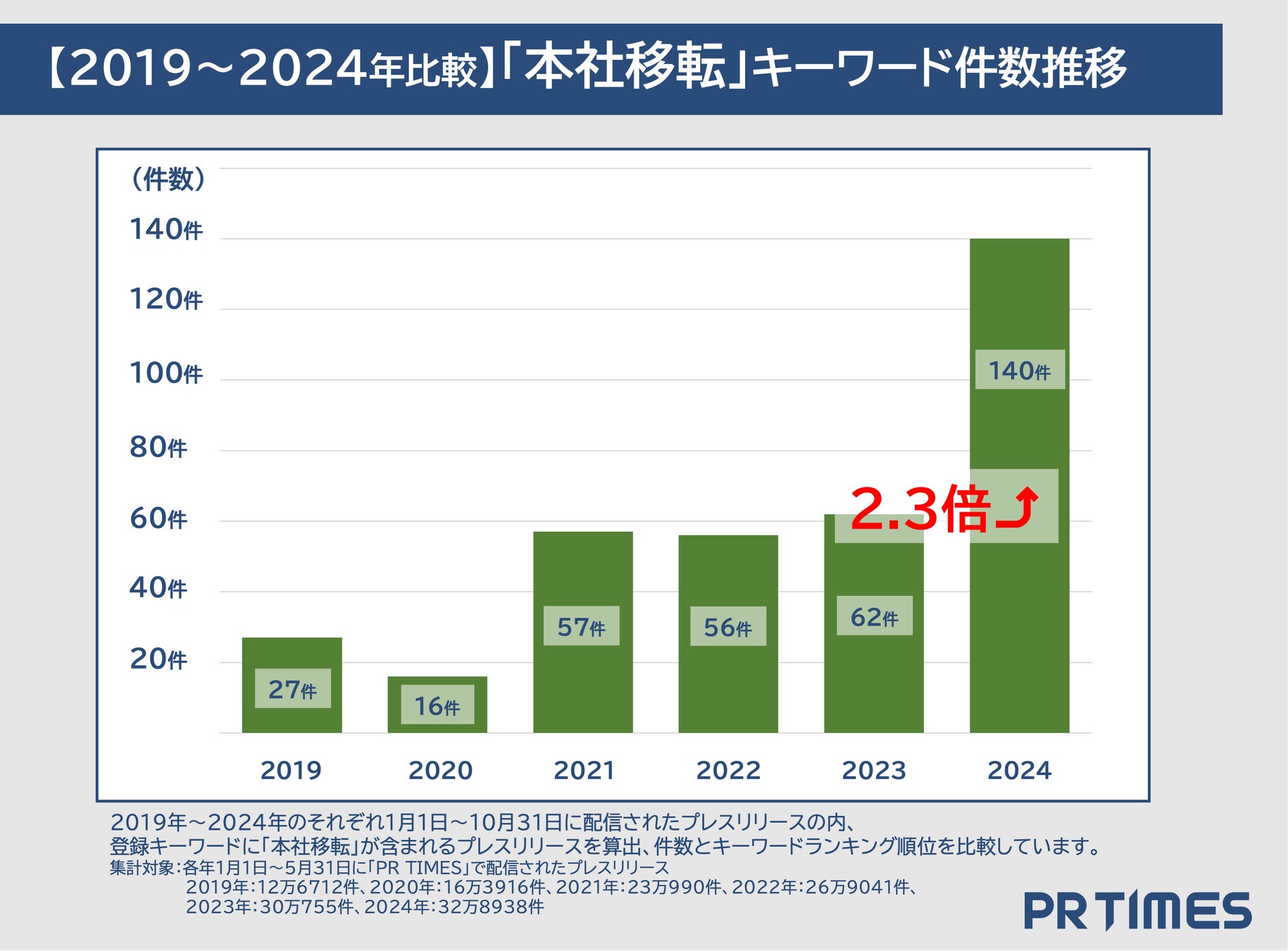 コロナ禍の始まりにあたる2020年に急減して以降、2021年〜2023年は増えつつも横ばいにあった「本社移転」のプレスリリースが2024年には前年比約2.3倍と急増しています。