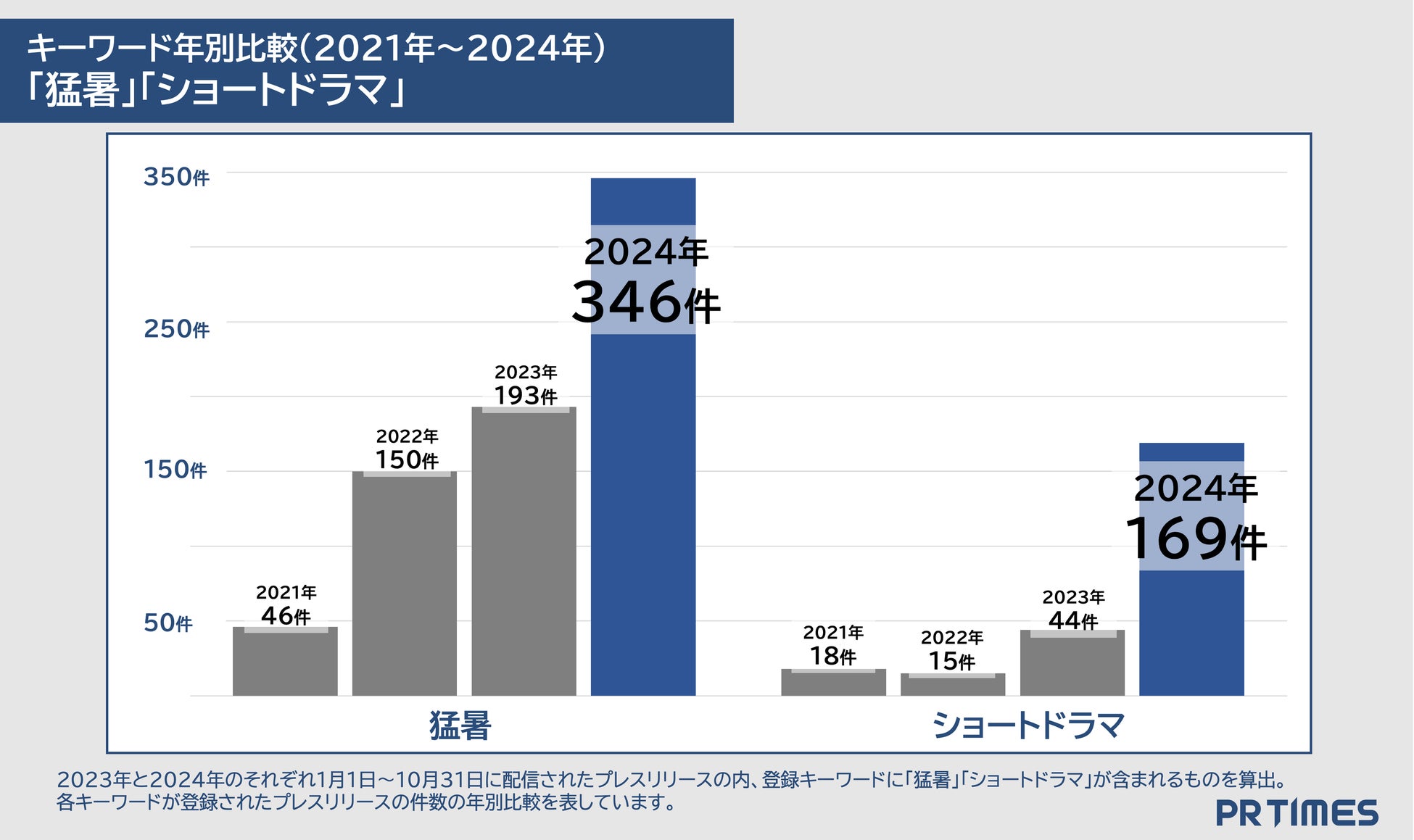 株式会社PR TIMES(本社:東京都港区、代表取締役:山口 拓己、東証プライム:3922)は2024年11月28日(木)、運営するプレスリリース配信サービス「PR TIMES」において、2024年1月1日〜2024年10月31日に企業から発表いただいたプレスリリース総計32万8938件を対象に、データ分析と総括、業界分析と各種ランキングなどを発表いたしました。