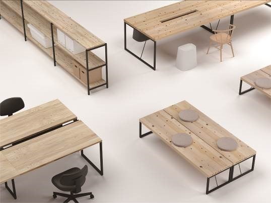 新たに2種類のパネルを追加し、産地が異なる板材を組み合わせても装着できるように再設計したスチールパーツと組み合わせて、ワークデスク、テーブル、ユニットシェルフ、ベンチとして販売します。フレームや脚をスチール製にすることで、頑丈で長く使える家具に仕立てています。