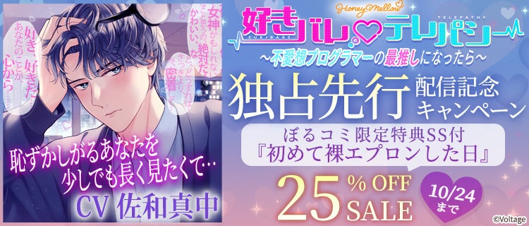 株式会社ボルテージ(本社:東京都渋谷区 代表取締役:津谷 祐司)は、シチュエーションボイスドラマレーベル「Honey Mellow」の新シリーズ「好きバレ」シリーズの第1弾「好きバレ❤テレパシー ~不愛想プログラマーの最推しになったら~」 (CV.佐和真中)を電子コミックストア「ぼるコミ」にて10月3日(金)より先行配信を開始したことをお知らせいたします。