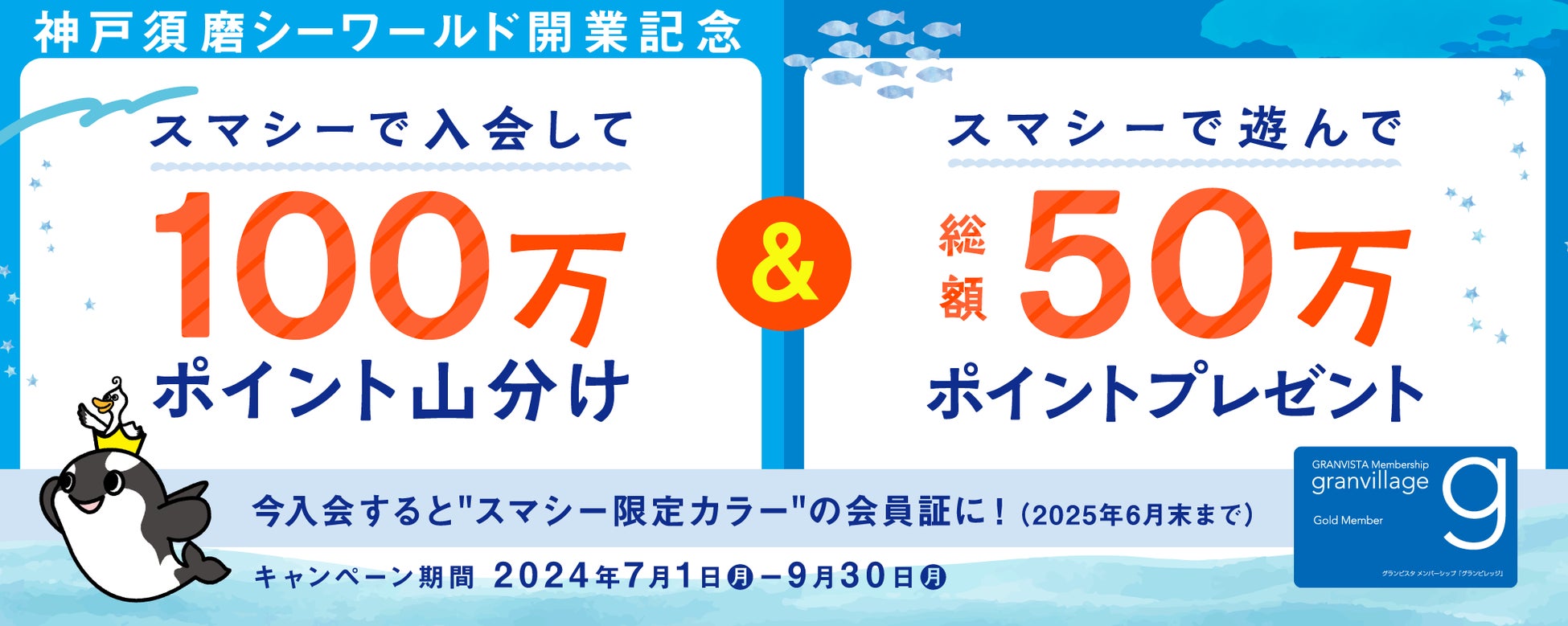 また、神戸須磨シーワールド・神戸須磨シーワールドホテルで入会された新規会員様全員を対象に、グランビレッジポイント100万ポイントを山分けで進呈いたします。さらに、両施設内で1店舗あたり5,000円(税抜)以上お買い上げいただいたグランビレッジ会員様の中から抽選で、神戸須磨シーワールド・神戸須磨シーワールドホテル内でご利用いただけるグランビレッジクーポンを、総額50万ポイント分プレゼントいたします。