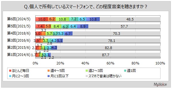 マイボイスコム株式会社(東京都千代田区、代表取締役社長:高井和久)は、6回目となる『スマートフォンでの音楽利用』に関するインターネット調査を2024年5月1日~7日に実施しました。