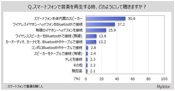 スマートフォンで音楽を聴く人の聴取方法は(複数回答)、「何も接続しないで、スマートフォン本体内蔵のスピーカーで聴く」が50.6%です。