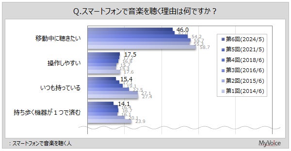 ■スマートフォンで音楽を聴く理由は、「移動中に聴きたい」がスマホで音楽を聴く人の46%、「操作しやすい」が2割弱。過去調査と比べて、「いつも持っている」は減少傾向