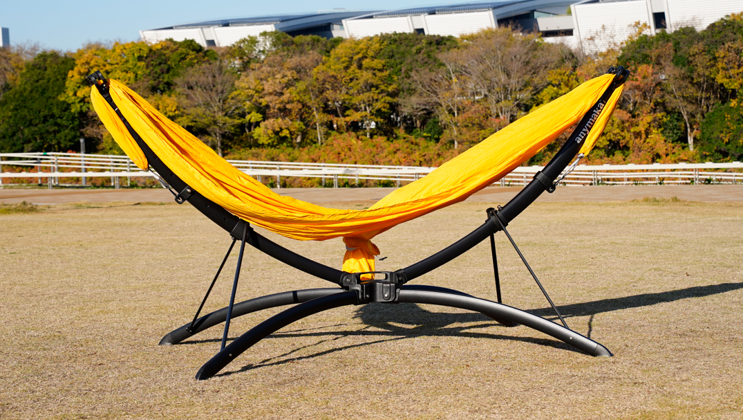 そしてキャンプのリラックスアイテムと言えばハンモック!という事で、たったの3秒で土台が完成する自立式のハンモックを体験する一同。その後、ゲームで負けた人が視聴者に自腹でハンモックをプレゼントする展開に。ルールはその場で足踏みを行い、「頭」「肩」「膝」など指示役が言う体の部位を両手でタッチ。「薪」の合図で目の前にある薪をいち早く手にした人が勝利というゲーム。今回は最後まで残った人がハンモック代を支払うということで、みんなやる気満々!