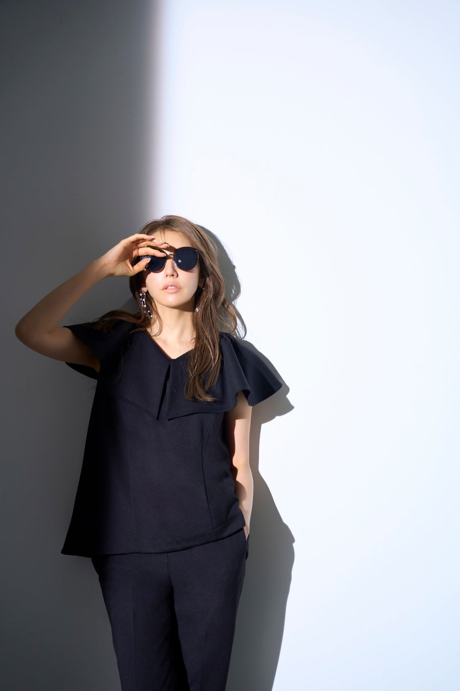 「色のほか、トップスのデザインでこだわったのはデコルテの見え方と二の腕部分。当初はもう少し首回りが狭くノースリーブのような見え方でしたが、デコルテがキレイに見えるよう少し襟ぐりを広げ、ビッグカラー部分を長くすることで肩先が隠れるようにしました。二の腕がカバーされることで華奢に見えつつ、お仕事などきちんとさを求められる場にも着られるようになっています」