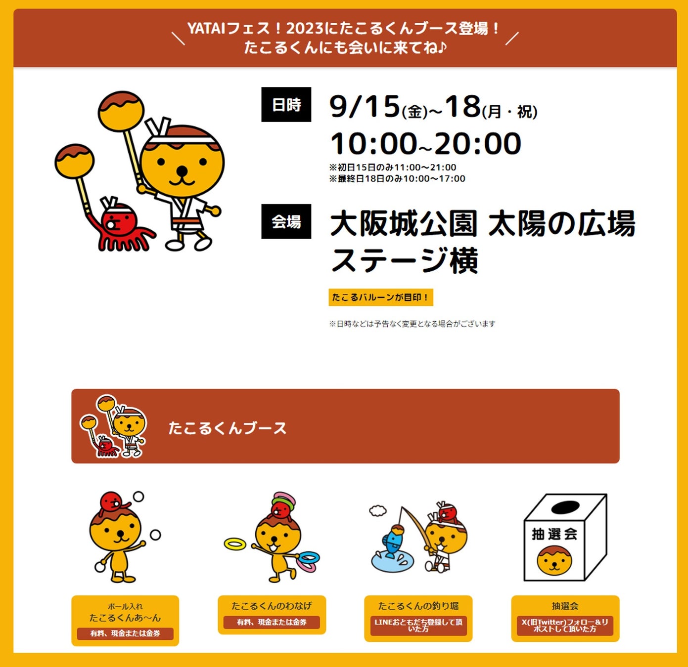 15日~18日はテレビ大阪キャラクター「たこるくん」がYATAIフェス!へ来場。クイズ大会やグリーティングを行います。