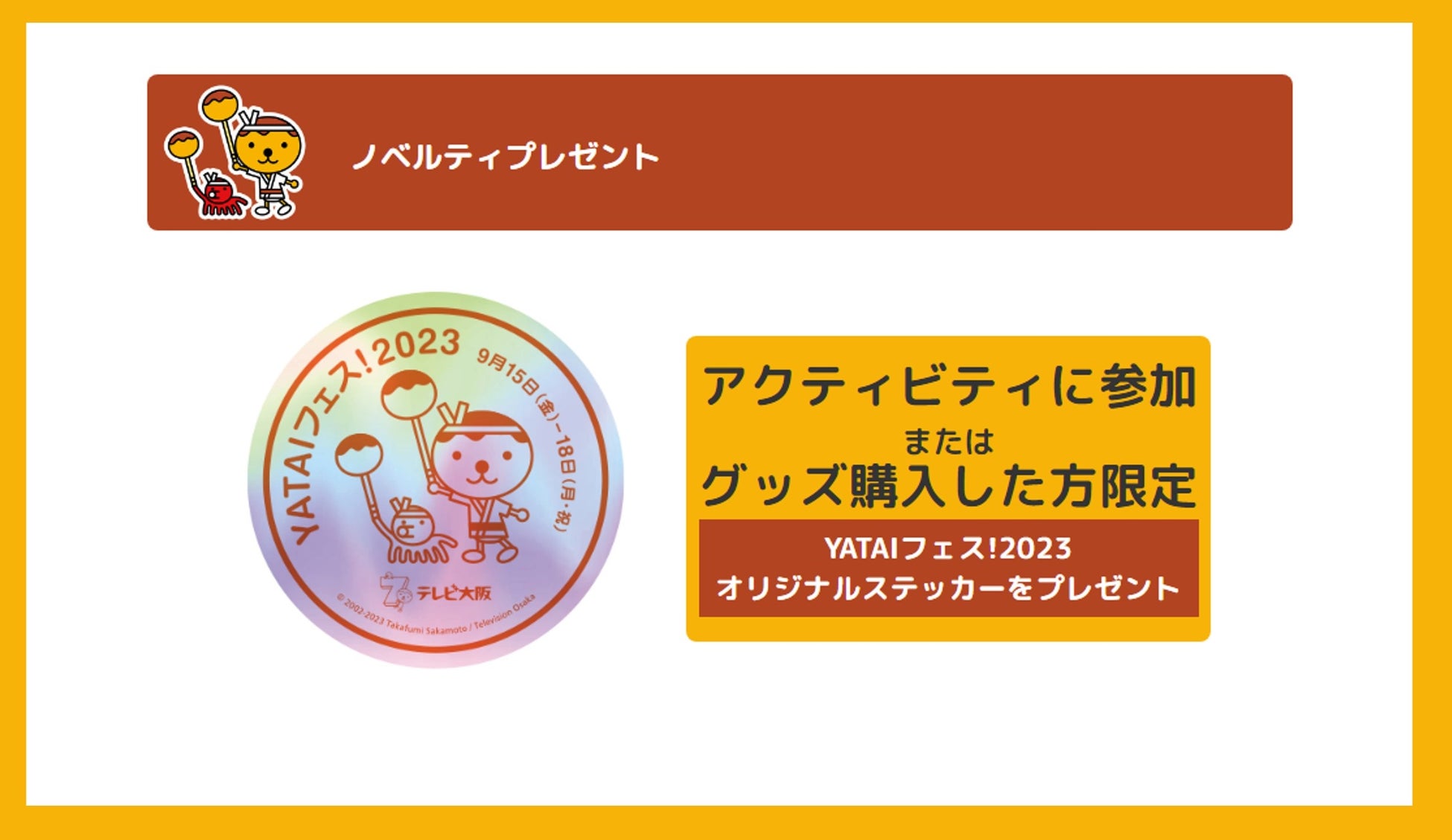 たこるくんブースで遊んでくれた方には、ここでしか手に入らない“たこるくんYATAIフェス2023ver”オリジナルステッカーをプレゼント‼